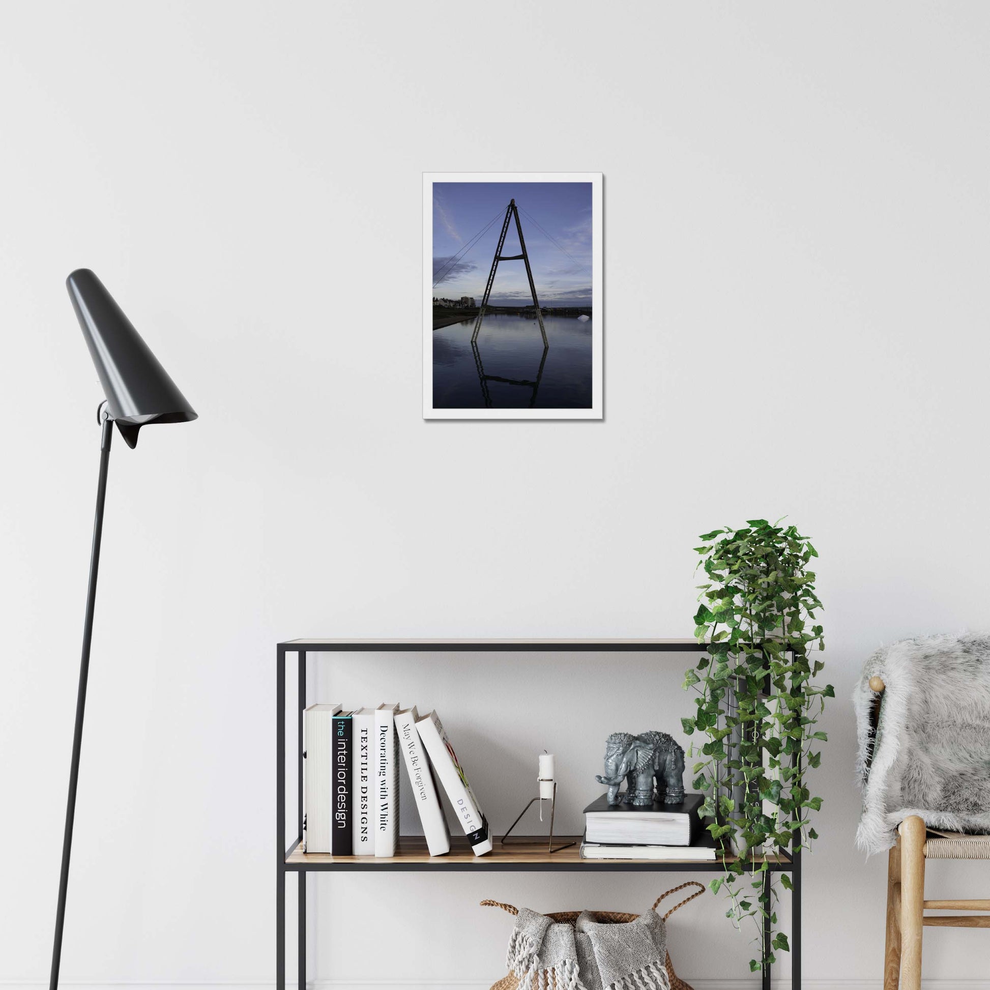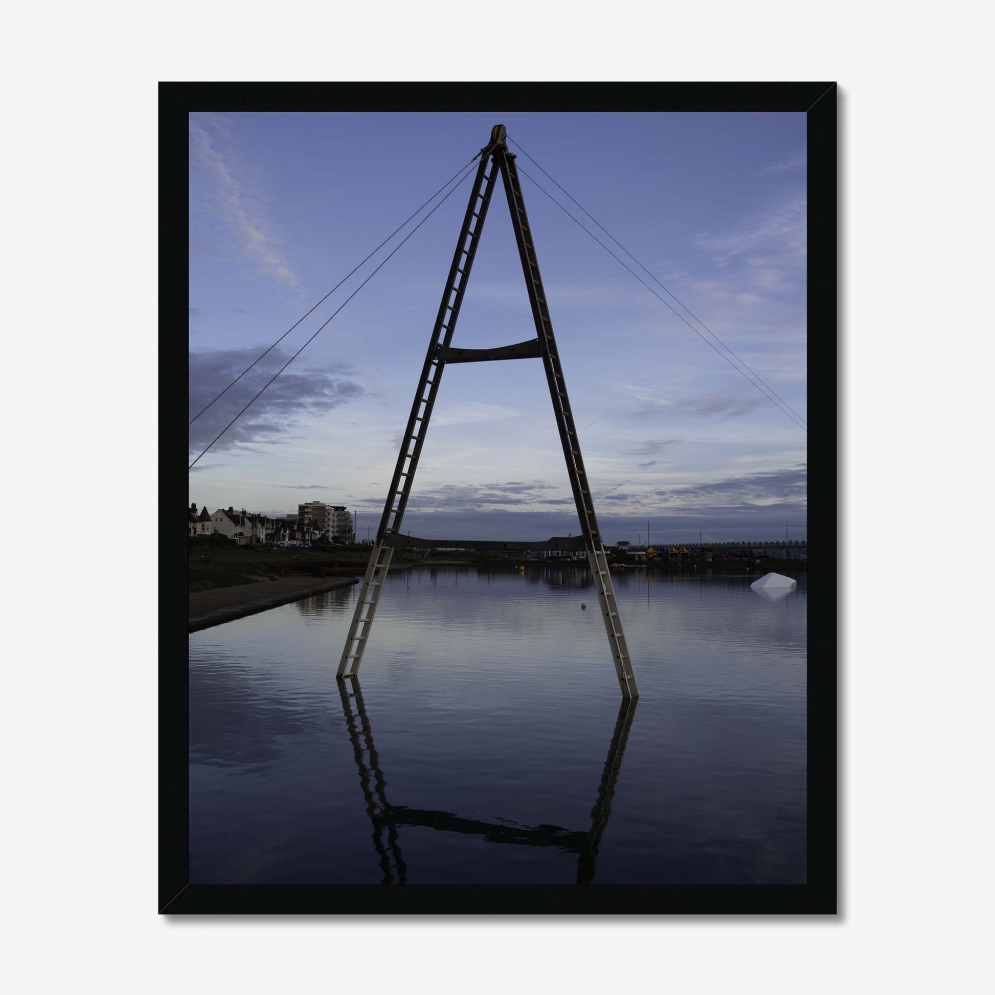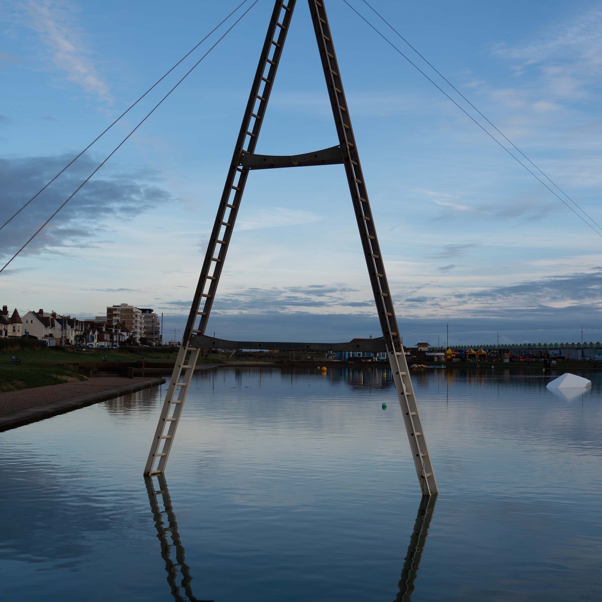 A dance of steel and serenity, the A-shaped structure commands the scene, perched above the reflective blue canvas of water, set against the backdrop of a boundless sky.