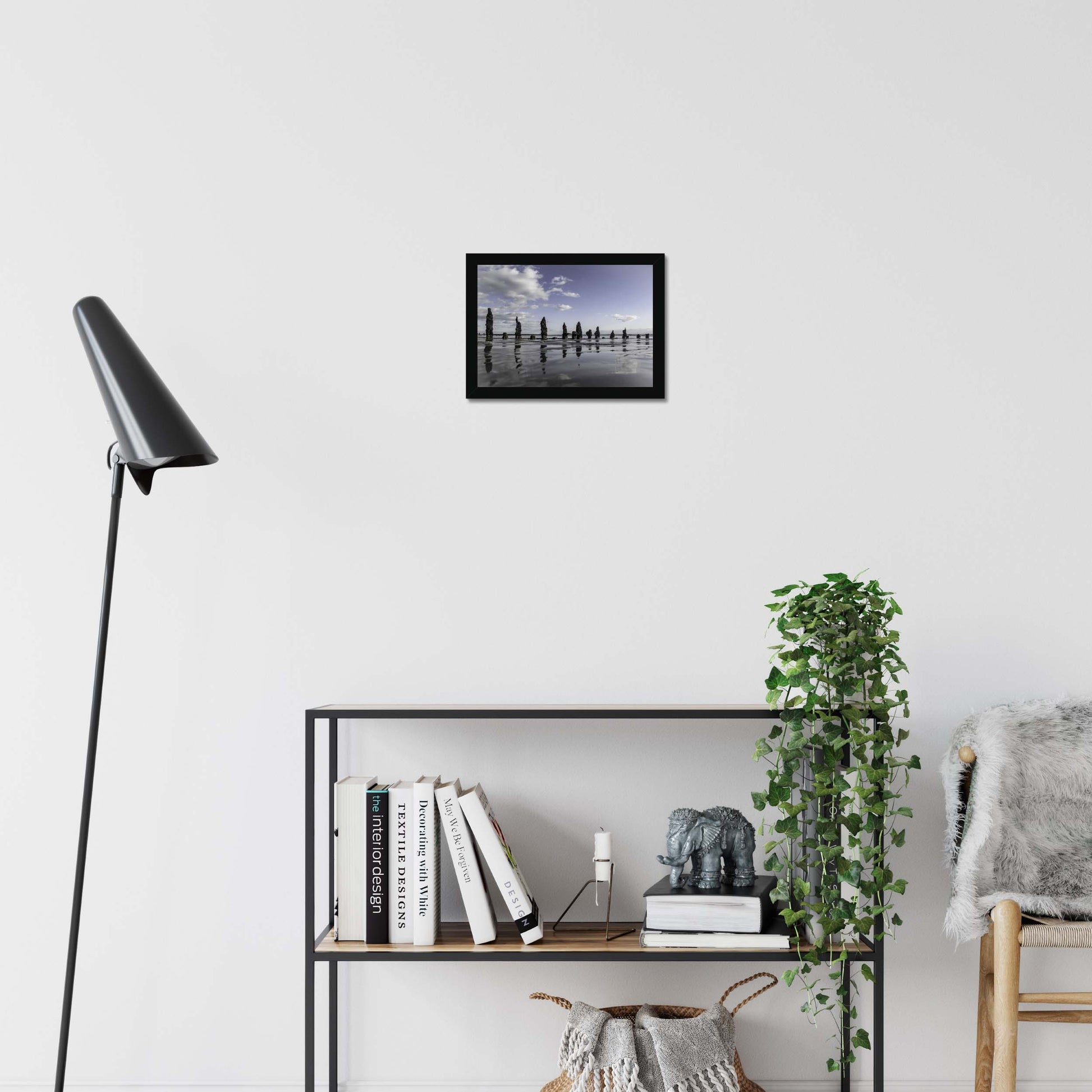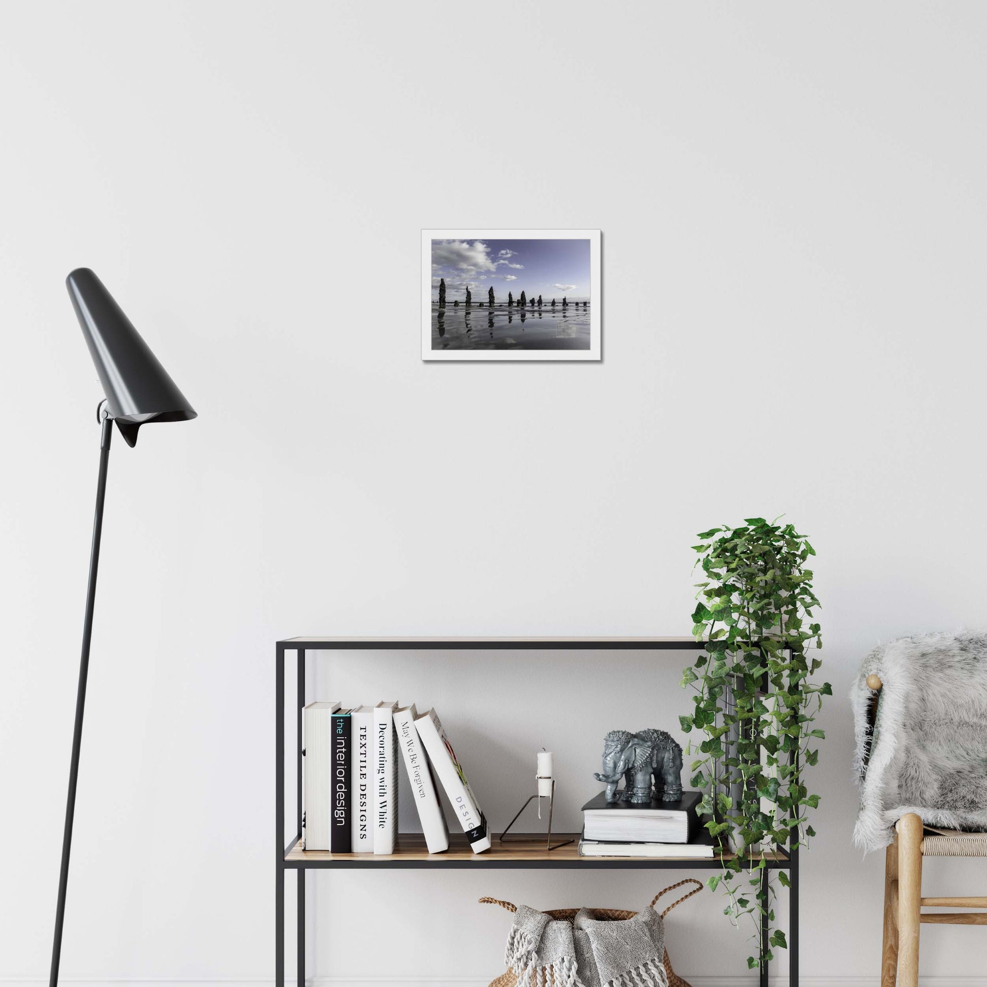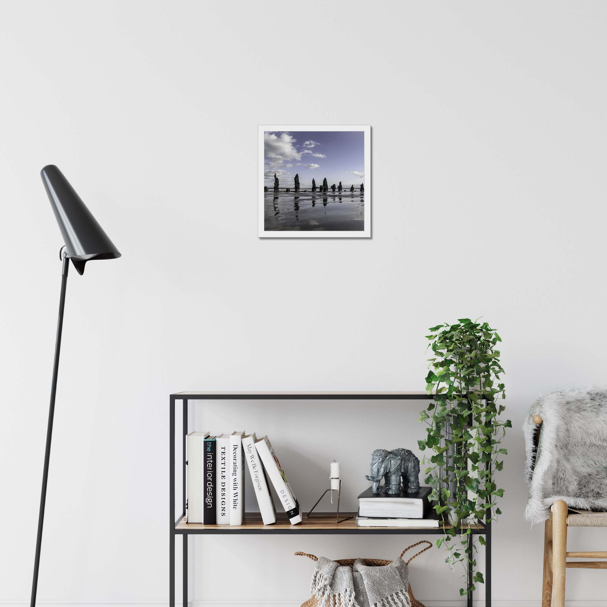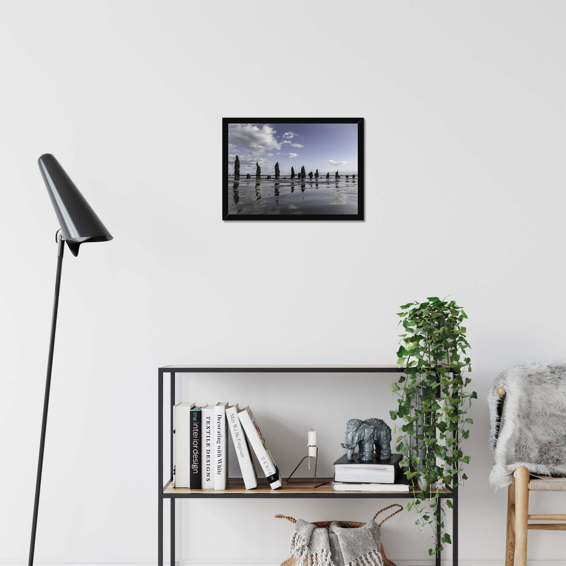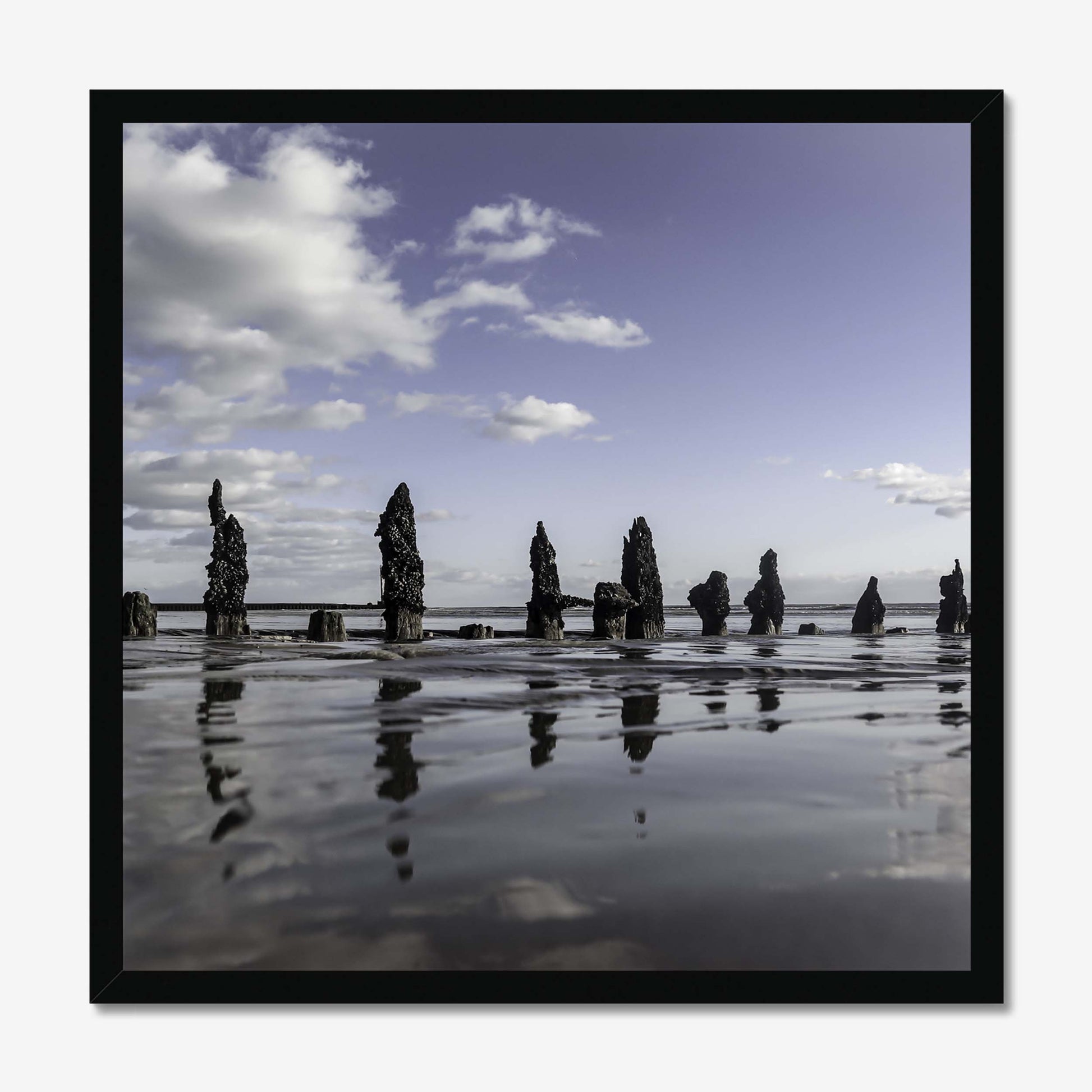 In the reflective dance of decay, weathered groynes stand stoically on the beach, their worn elegance mirrored in the tranquil waters, a testament to the passage of seasons.