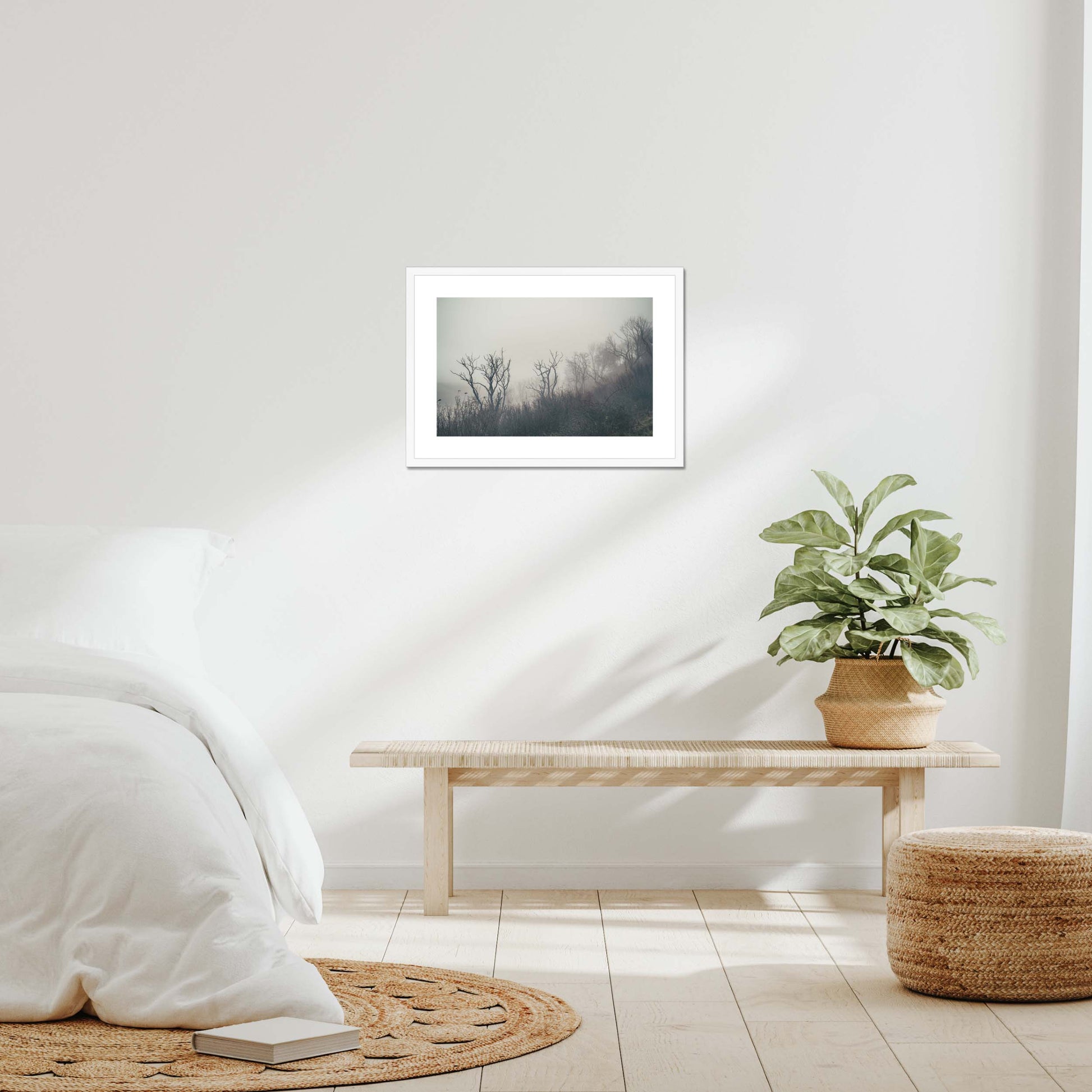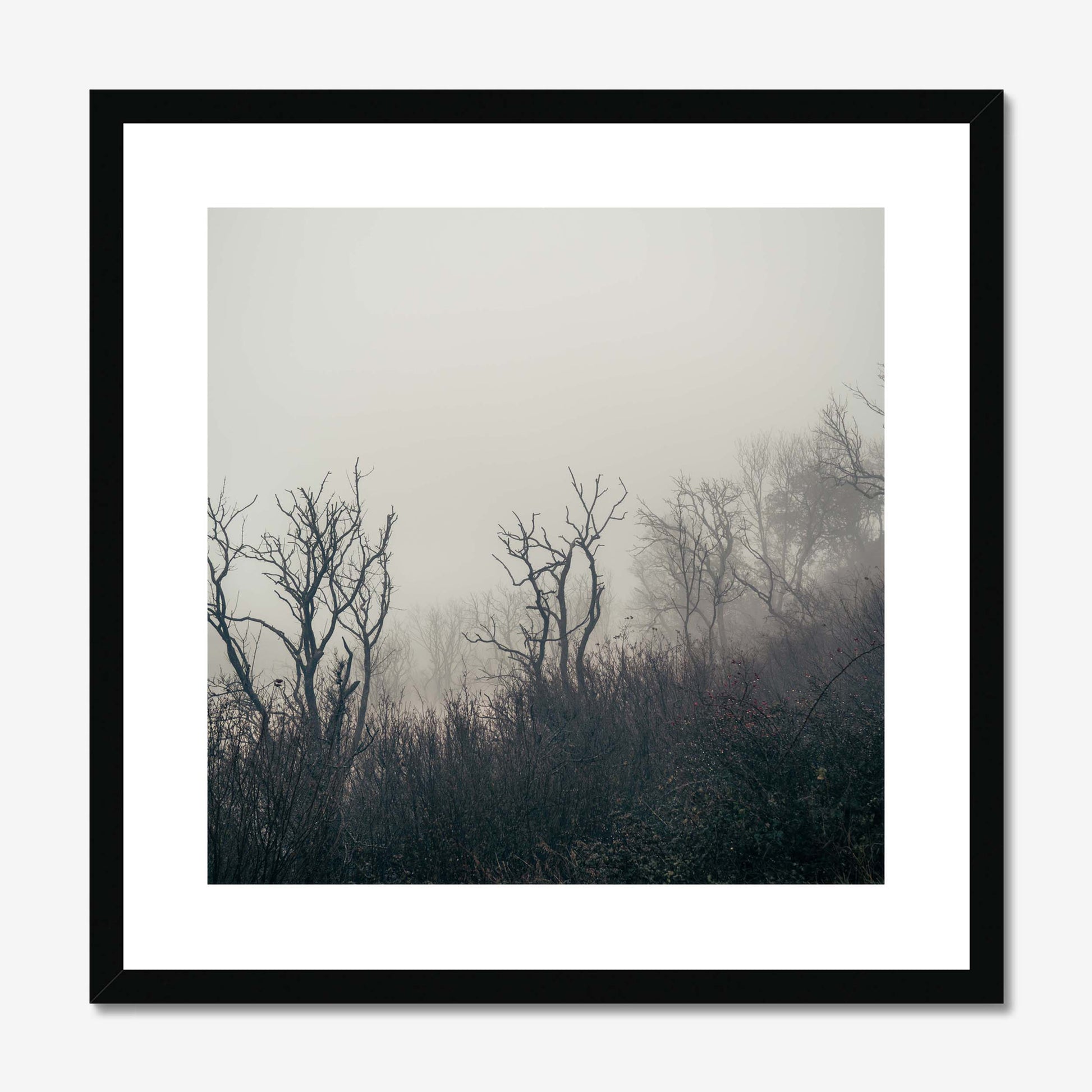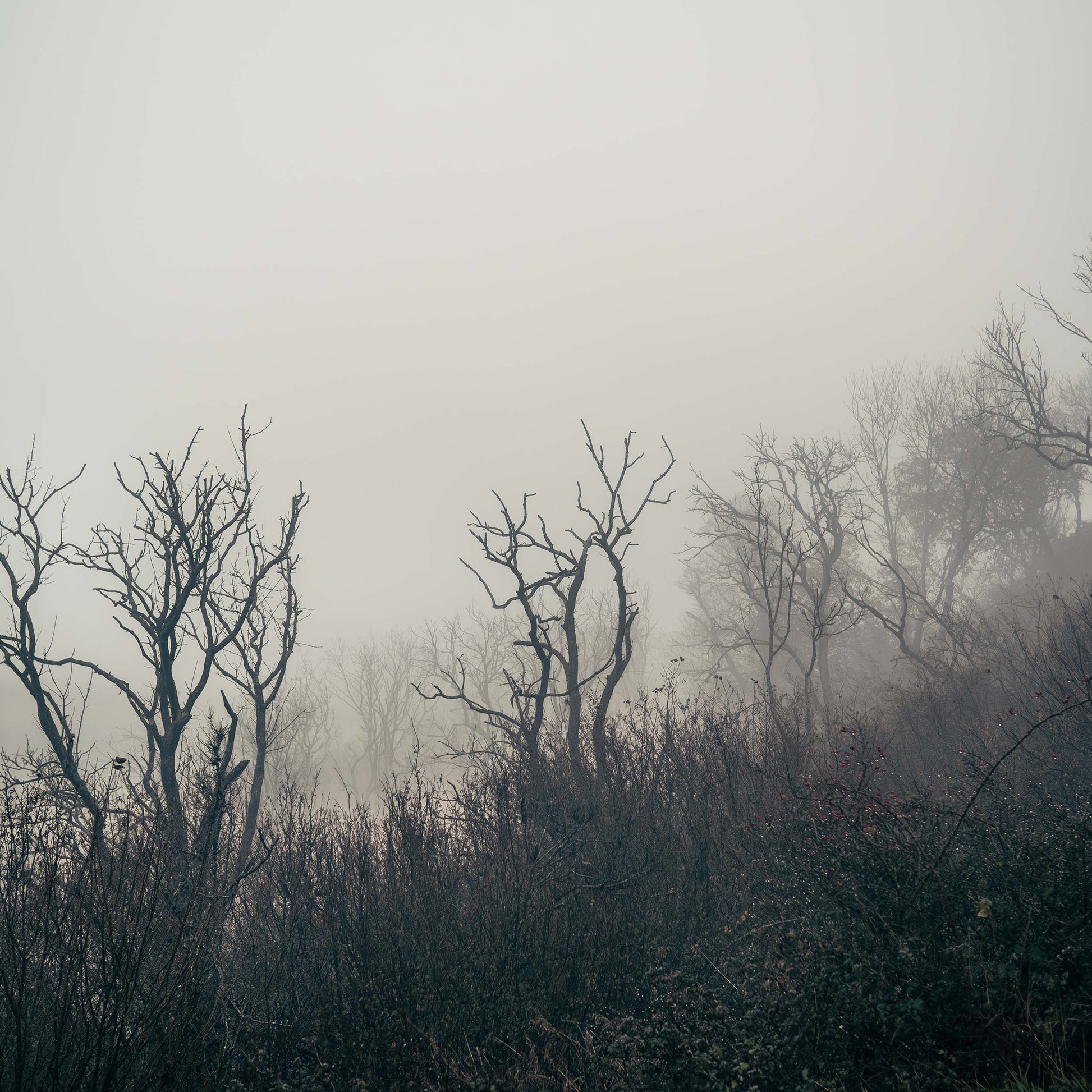 A dance of shadows and mist unfolds in this ghostly monotone image, where the detailed silhouettes of trees and bushes seamlessly dissolve into the enchanting fog,