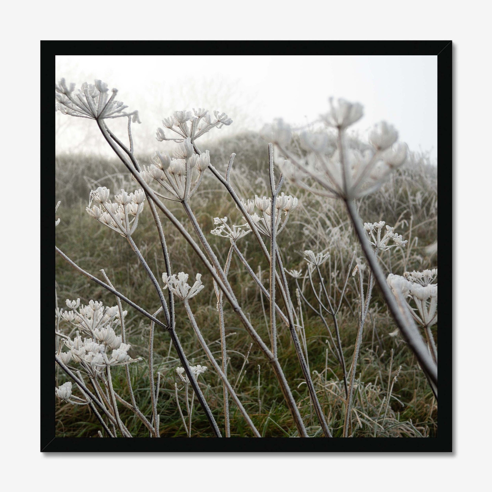 In the heart of winter's embrace, a close-up reveals the artistry of frost-laden plants, their edges glistening like nature's own delicate lace against the icy backdrop.